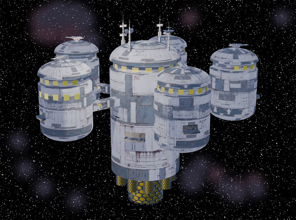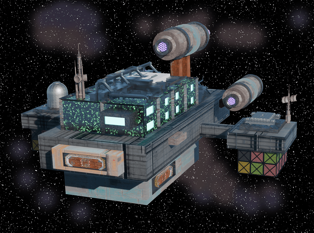 Sometimes it pays to be obsessive. It’s been a struggle, but I’ve managed to produce what I imagine their spaceship looks like. It’s got an engineering and command/control pod in the center, with passenger and cargo pods arranged around it. The engines (what I’ve whimsically called “ghost drives”) are attached at the bottom of the central module.