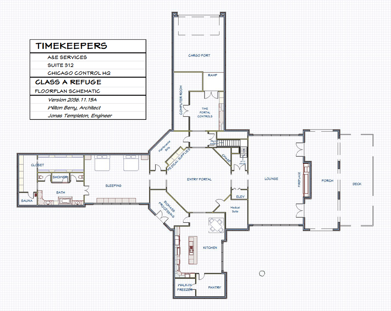 The Timekeepers constructed more-or-less standardized refuges scattered geographically and in deep time. These served as retreats for rest and recreation, as regrouping points, and as safe havens when an agent needed one. To assure that future archeologists would not find remains of the structures, they constructed the retreats on sites that would eventually undergo geologic catastrophe. Timekeepers located their Training Academy, for example, sixty-six million years ago, near what is now Chixulub, Mexico, the site of the dinosaur-killing meteor strike.